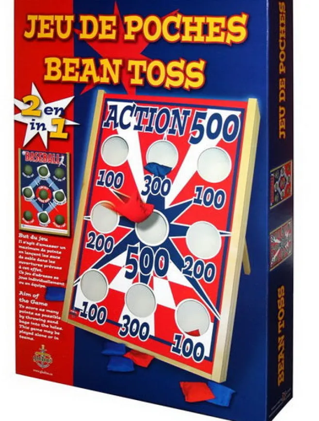 Ce jeu de poches présente une façade réversible. Le but du jeu est d’accumuler un maximum de point en lançant les sacs de sable dans les ouvertures prévues à cet effet. Ce jeu d’adresse se joue individuellement ou en équipe.