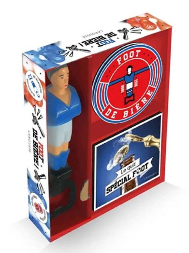 Coupe du monde, Euro, équipe de France, foot féminin, etc., cinquante quiz pour tester ses connaissances sur le foot accompagnés d’un décapsuleur en forme de joueur de babyfoot et de deux sous-bocks.